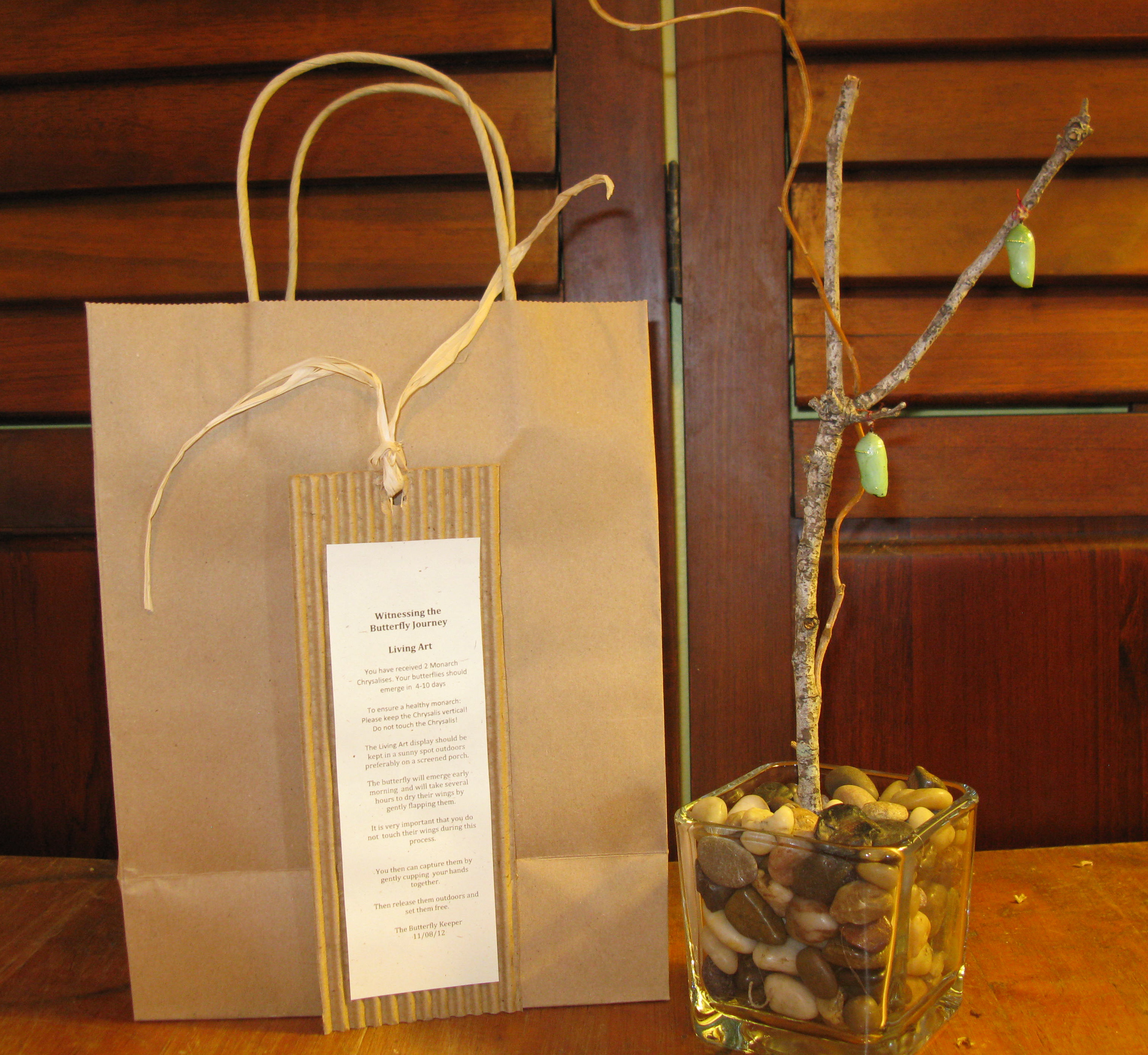 Your Monarch Tree will Include: Square Glass Vase, Riverbed pebbles, Found Twig, Curly Willow, Air Ball Moss, 2 Monarch Chrysalises, Hand Tied Ribbon, Enclosure Card, Keepsake Bookmark with Pewter Butterfly Charm and Handling instructions.